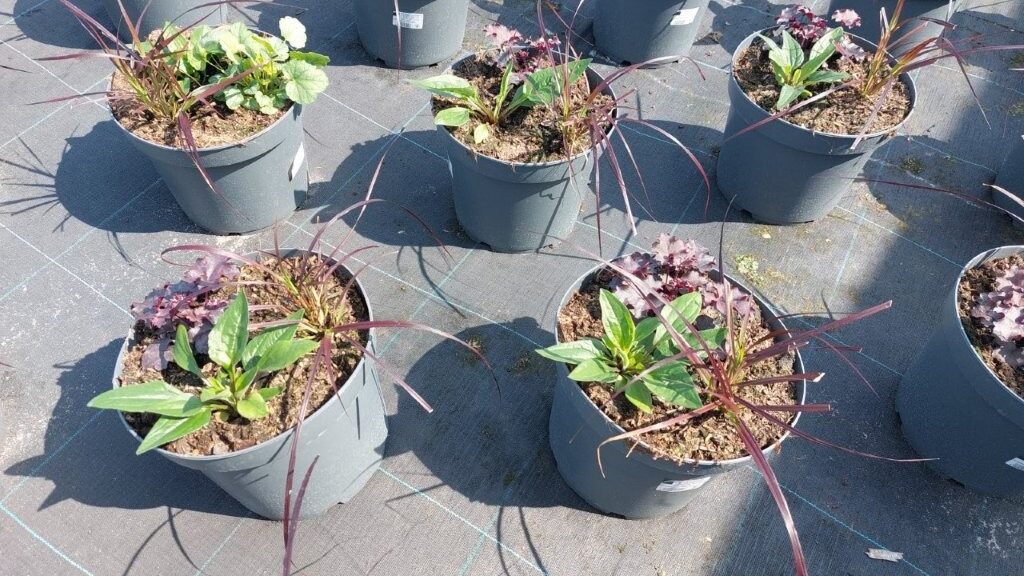 Below Hartwig Bull with ‘Hot Pink, Pennisetum ‘Rubrum’ and Heuchera ‘Mint Marquee’ from Kientzler. We like to use the first year flowering Heuchera for the extra flower!